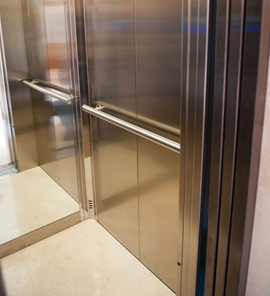 In acciaio, pavimento in marmo, illuminazione diffusa a mezzo controsoffittatura, specchio tutta parete e corrimano in acciaio